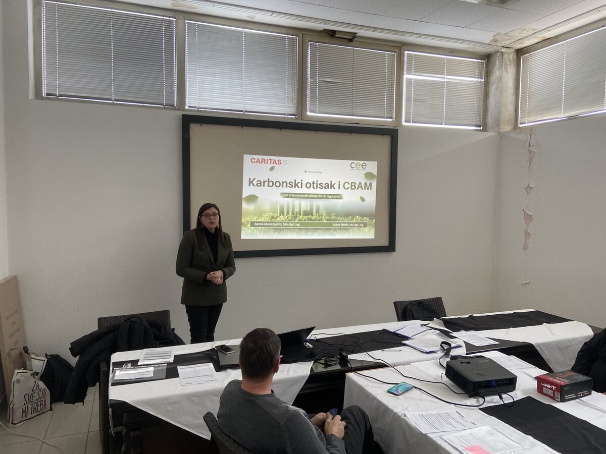 Prvo predavanje je bilo usmjereno na jačanje znanja i kapaciteta profesora srednjih tehničkih škola u oblasti karbonskog otiska i Mehanizma za ugljičnu prilagodbu na granicama (CBAM), kao jednog od ključnih instrumenata klimatske politike Evropske unije, čiji je cilj osigurati pravedno oporezivanje emisija CO₂ i spriječiti tzv. ”curenje ugljika“.